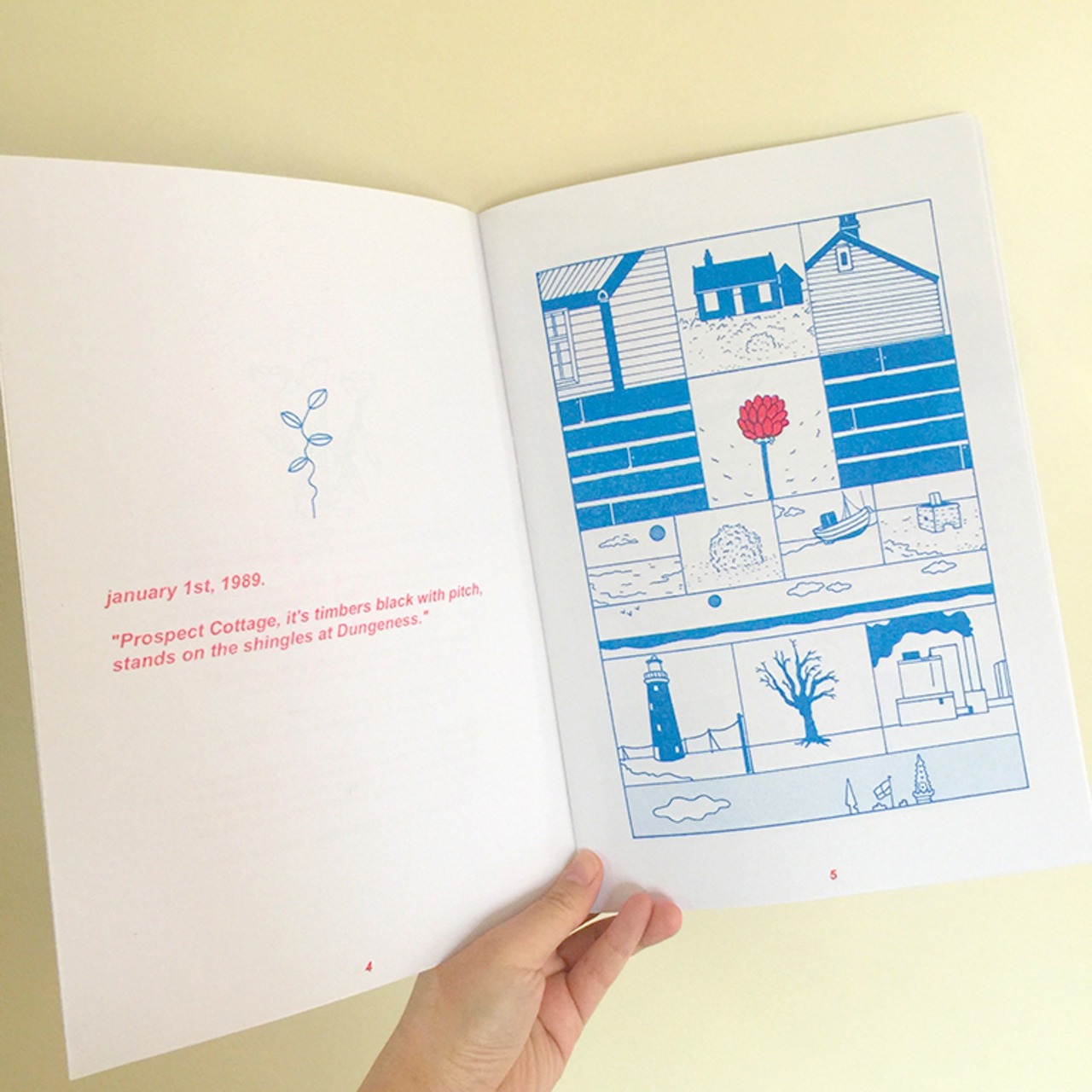 クィア・アクティヴィスト、アーティスト、作家、映像作家で庭師だったデレク・ジャーマンが、エイズを発病し晩年を過ごしたダンジェネスにある“プロスペクト・コテージ”。そこに彼が造り、見ていた風景と日記の断片に想いを馳せ描かれたコミックジン。最後の作品Blueを彷彿させる青く静かな世界に滴る鮮やかな赤が、脈打つような生を想わせるリソグラフ2色刷り。